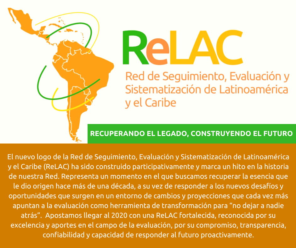 El nuevo logo de la Red de Seguimiento, Evaluación y Sistematización de Latinoamérica y el Caribe (ReLAC) ha sido construido participativamente y marca un hito en la historia de nuestra Red. Representa un momento en el que buscamos recuperar la esencia que le dio origen hace más de una década, a su vez de responder a los nuevos desafíos y oportunidades que surgen en un entorno de cambios y proyecciones que cada vez más apuntan a la evaluación como herramienta de transformación para “no dejar a nadie atrás”. Apostamos llegar al 2020 con una ReLAC fortalecida, reconocida por su excelencia y aportes en el campo de la evaluación, por su compromiso, transparencia, confiabilidad y capacidad de responder al futuro proactivamente.